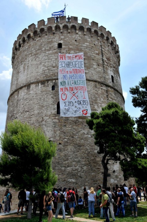 Members of Syriza’s youth symbolically placed a canvas “Anti-austerity” in the White Tower of Thessaloniki, with whom are making a protest in favor of the “no” in the referendum proposals to creditors. The AFP captured the image.